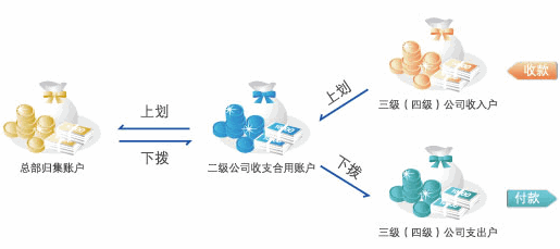 3)集团成员三级或四级公司在当地建行开立两个单位银行结算账户,作为“收入账户”和“支出账户”使用。收入账户只收不付,实行零余额管理,每日清零,账户资金定时、自动、逐级划转至集团公司账户;支出账户只支不收,账户实行零余额管理(或存有固定余额),日间在核定的支用额度之内透支对外支付,透支资金由集团公司日终逐级下拨填平。