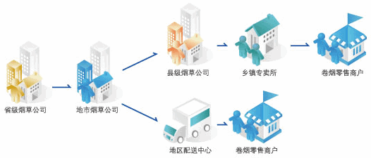 烟草行业实行生产和销售相对分离的经营模式,卷烟销售资金是烟草行业资金链的源头,也是实施资金集中管理的基础,卷烟销售实行专卖管理,销售组织体系如下图。