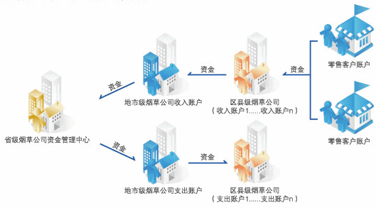 省级资金管理中心实施收支两条线下的资金集中管理,地市级(区县级)烟草公司收入账户资金日终自动逐级上划至资金管理中心账户,成员单位日间支付时,在资金管理中心核定的周期支付限额内支付,可直接由资金管理中心拨付,也可日间透支、日终与资金管理中心统一清算。