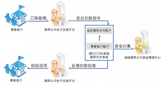2.建行还可通过银行系统和烟草公司的电子交易平台实现直联,烟草公司将定单输入电子交易平台系统并向建行发送扣款信息后,实现卷烟购货款的实时在线代扣,建行扣款后实时反馈扣款结果,烟草公司据此形成卷烟配货信息。
