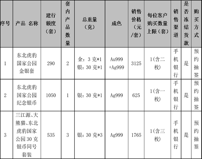 1.应有关要求,本次贵金属纪念币面向实名客户销售,东北虎豹国家公园金银纪念币采用“预约抽签”方式确定可购买的客户。本产品对应的每位客户购买数量上限等请见本公告第一条中“具体产品信息”内容。