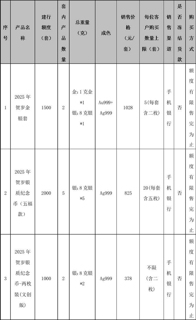 根据中国人民银行贵金属纪念币发行安排,“2025年贺岁金银纪念币”已于近日公告发行,我行根据安排将参与本产品第二批的销售工作。现将有关事项公告如下: