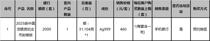 1.应有关要求,本次贵金属纪念币面向实名客户销售,2025版中国龙银质纪念币采用“预约抽签”方式确定可购买的客户。本产品对应的每位客户购买数量上限等请见本公告第一条中“具体产品信息”内容。
