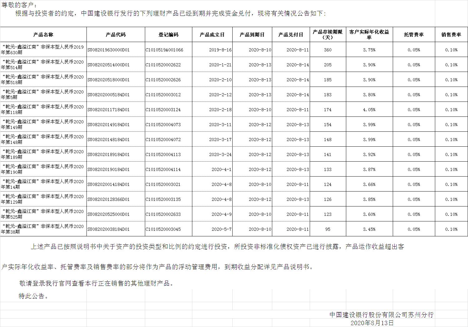 中国建设银行理财产品终止及清算公告